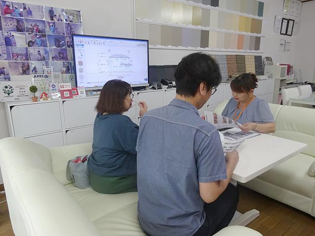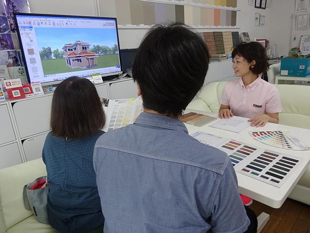 打ち合わせの際にはパソコンやテレビ画面を使用してカラーシュミレーションを行います。