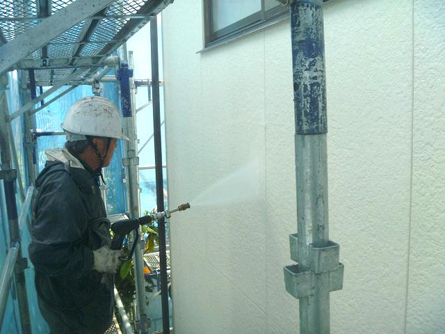 長年の汚れを落とす為に建物の高圧洗浄を行います。