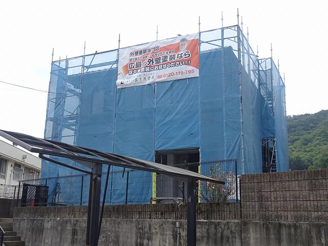 細心の注意をはらい足場を組み立て安全な現場を作ります。塗料が散っても大丈夫なように飛散防止ネットで養生します。